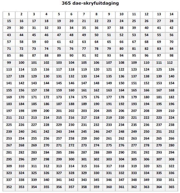 Eenvoudig, nè? Waarvoor wag jy dan? Druk die meegaande tabel uit en begin skryf. Binnekort is jy ‘n ervare skrywer met ‘n boek om vir al jou moeite te wys. Sterkte!