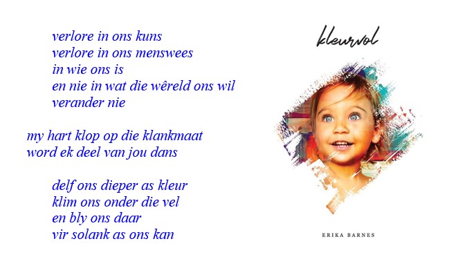 Digkuns het my op skool al ore aangesit, veral wanneer ek moes probeer uitpluis wat die digter nou eintlik wou sê. Erika Barnes se nuutste bundel, en ook haar eerste Afrikaanse een, kleurvol, is nie iets wat jy hoef te probeer uitpluis nie. Jy kan dit net lees, geniet en lekker oordink. Dit is die tweede digbundel wat ek binne ʼn jaar lees: Die ander een was ʼn Ander wêreld deur Eunice Basson, uitgegee deur Protea Boekhuis. Soos ek tóé ook gesê het: Ek lees gedigte omdat dit vir my lekker is. Ek kan nie ʼn ontleding doen soos prof Alwyn Roux nie, maar ek kan darem uitstekende skryfwerk herken wanneer ek dit raaklees en dit beslis daarom baie geniet. Dit is duidelik op die agterblad van kleurvol: Hierdie digbundel is ʼn invloedryke, pragtige verhaal waar twee onwaarskynlike wêrelde bots. ʼn Verbode liefde in hierdie moderne wêreld, waar hoop konflikterende fronte bymekaar bring. Dit ontlont ʼn liefde wat die ware kleure van hoop oopvlek. Voorwoord: Die bundel is ʼn verhaal van hoop, verlies, aanvaarding en liefde. ʼn Verbode liefde in ʼn moderne wêreld, waar ons soms geskei word deur versperrings, sigbaar of onsigbaar. Hierdie verse weerspieël die uithouvermoë van harte, vasgekleef aan die liefde wat saak maak. Die verhaal stap ʼn pad deur die aksies, emosies en dieper gedeeltes van ons ondervindinge; ʼn diverse perspektief. Om uiteindelik die gevoel van eenheid, en belangriker, hoop, vas te vang – waar ons dieper kan lief hê en vashou aan die kleure van hoop. Niks van wat ek hieronder gaan deel, gaan sin maak nie, want niks is uit een gedig nie ... dis random reëls wat vir my mooi is, wat ek graag deel.