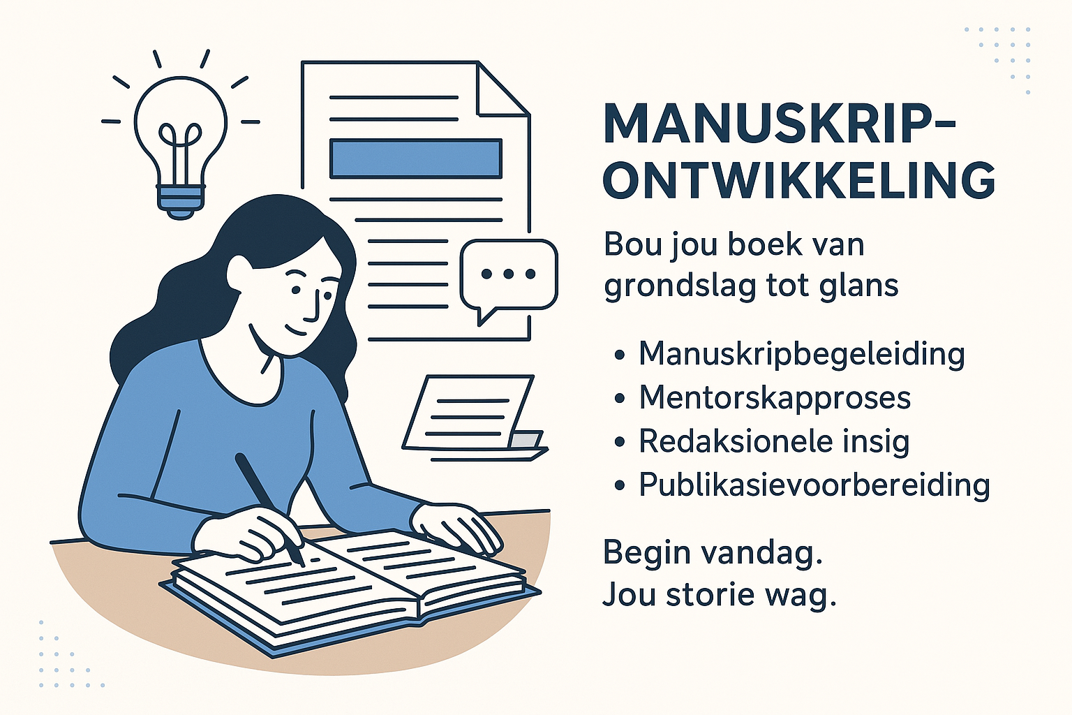 Laat ons jou help om jou droom van ’n voltooide manuskrip te verwesenlik. Ons manuskripontwikkelingsdiens is spesifiek daarop gemik om jou storie na die volgende vlak te neem. Kontak ons om jou kreatiewe reis te begin!