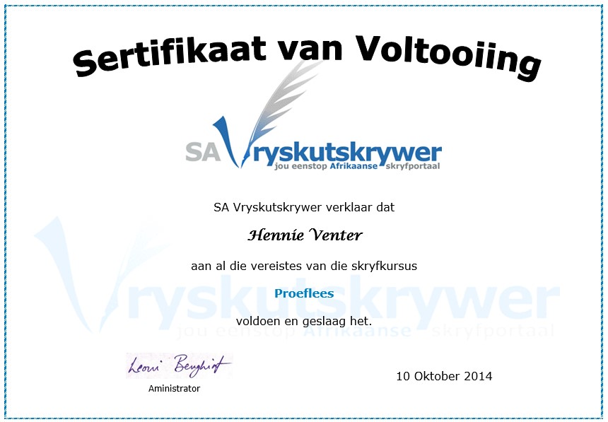 • Indien jou sertifikaat nie hier is nie, stuur dit asseblief aan ons.