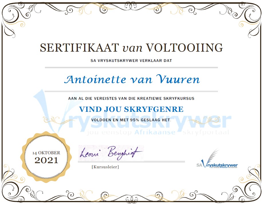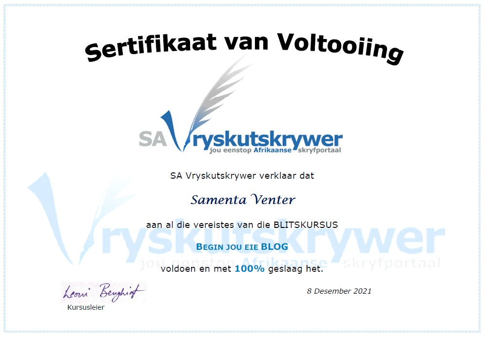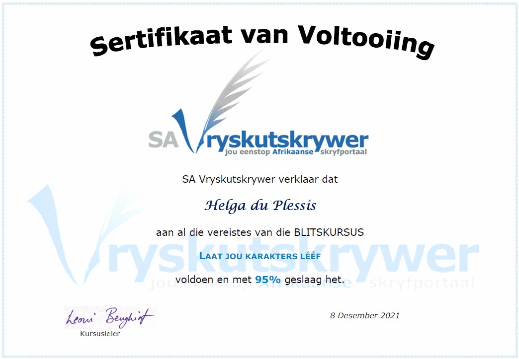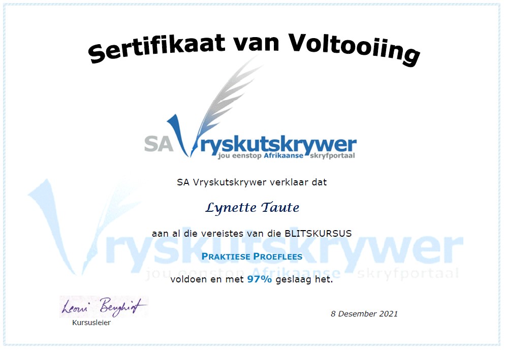 Indien jou sertifikaat nie hier is nie, klik asseblief hier om dit aan ons te stuur.