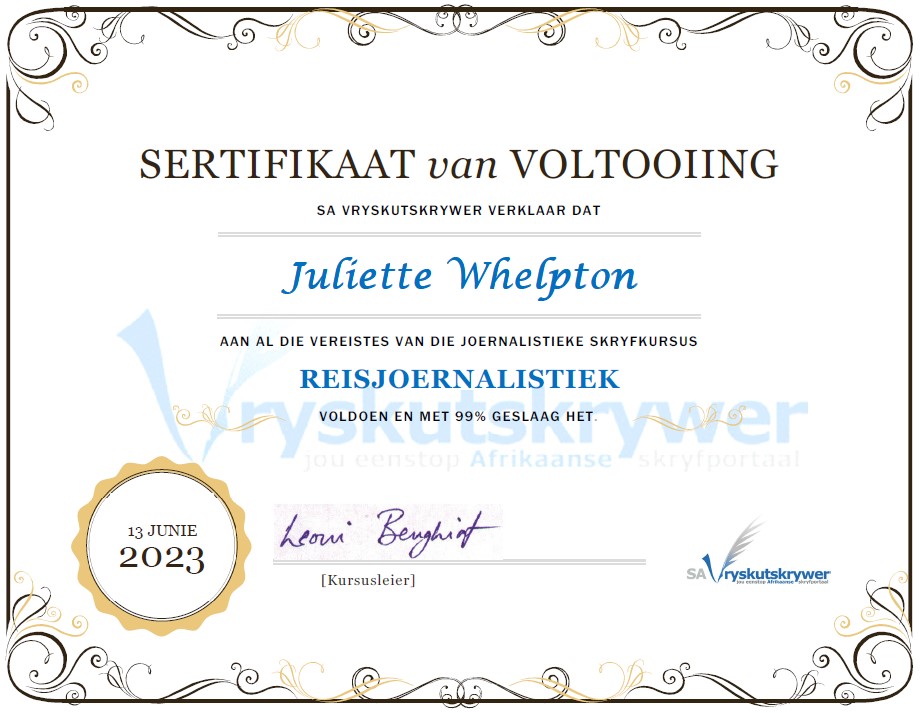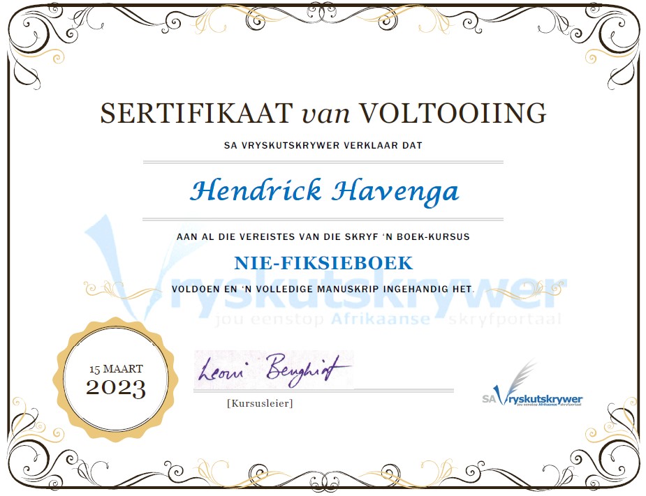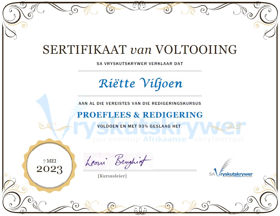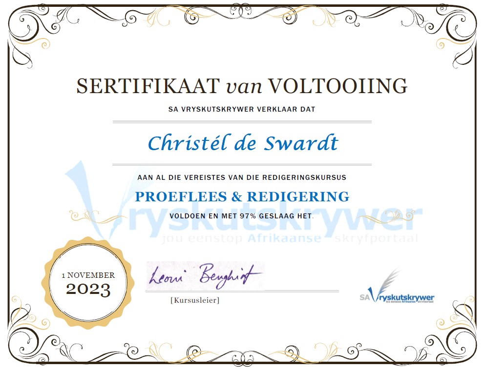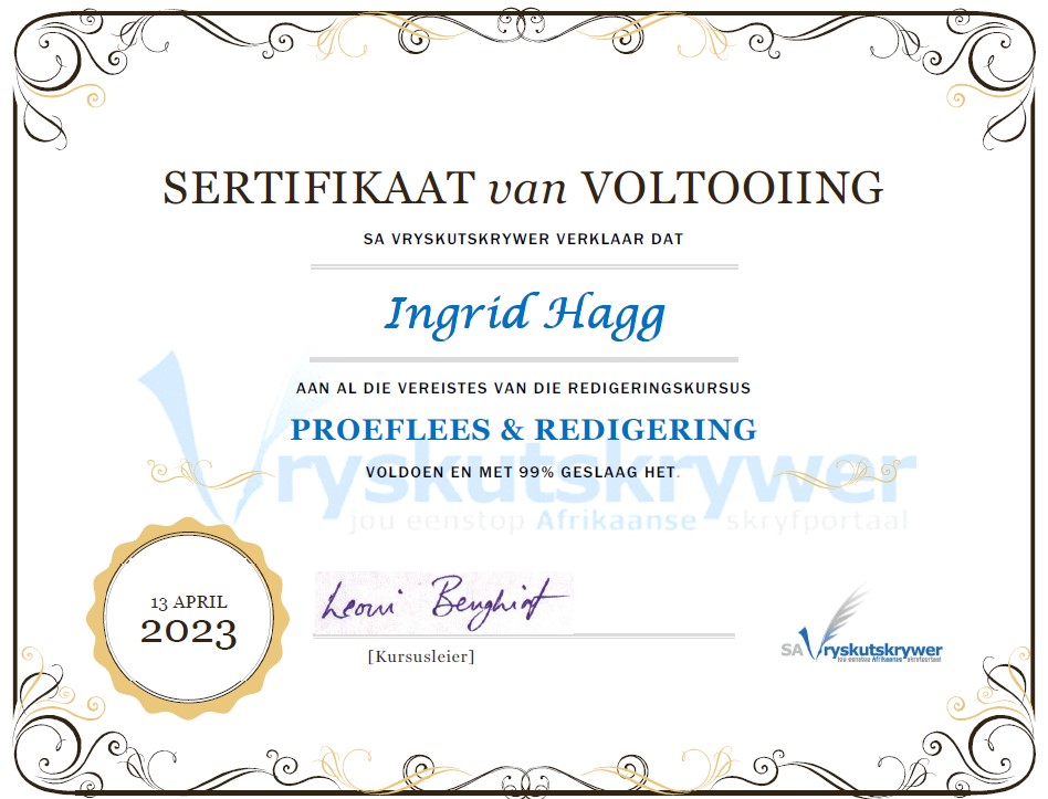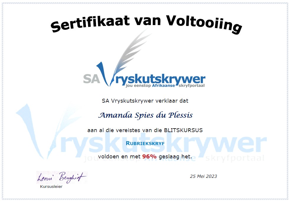 Indien jou sertifikaat nie hier is nie, klik asseblief hier om dit aan ons te stuur.