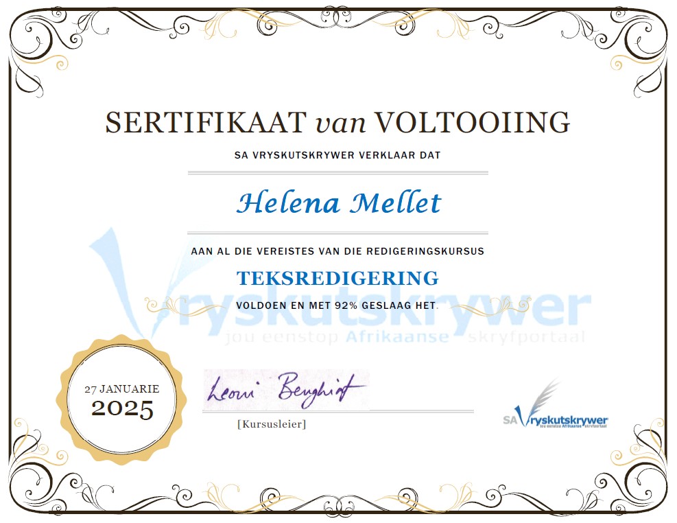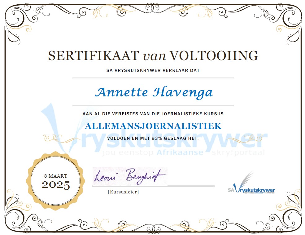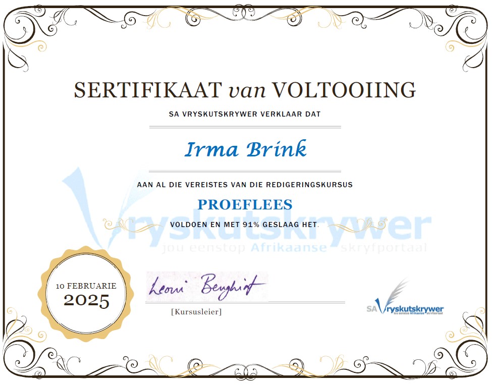 • Indien jou sertifikaat nie hier is nie, klik asseblief hier om dit aan ons te stuur.