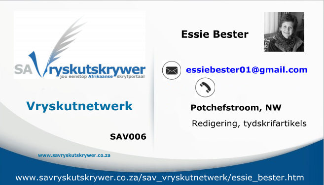 Meer onlangs het ek 'n kursus Tydskrifjoernalistiek, ook by SA Vryskutskrywer, voltooi en dit opgevolg met 'n kursus in Gevorderde Tydskrifjoernalistiek. Op grond hiervan het 'n ek 'n pos as permanente vryskutartikelskrywer by Solidariteit gekry. My artikels is al in verskeie tydskrifte en koerante gepubliseer, waaronder Rooi Rose, Vrouekeur, Beeld en ook aanlyn by Netwerk24.