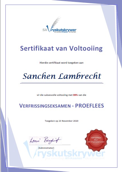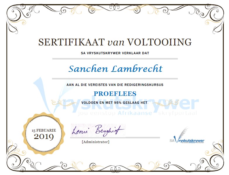 Na haar aftrede het sy in 2019 'n proefleeskursus by SA Vryskutskrywer gevolg. In 2020 het sy ʼn Verfrissingseksamen afgelê in proeflees by SA Vryskutskrywer en haarself verseker van opgeknapte kennis.