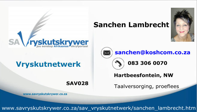 Sanchen Lambrecht het jare gelede gematrikuleer en daarna haar Hoër Onderwysdiploma verwerf. Sy het skoolgehou by verskeie skole en alhoewel sy betrokke was by Grondslagfase-onderrig, het sy elke geleentheid benut om Afrikaans as taal te bevorder.